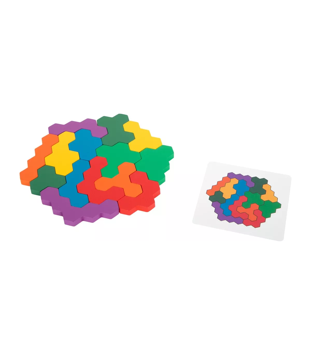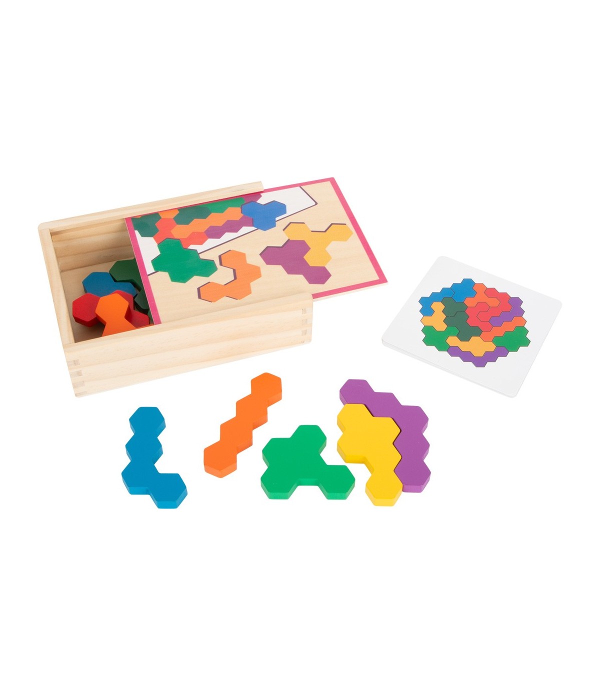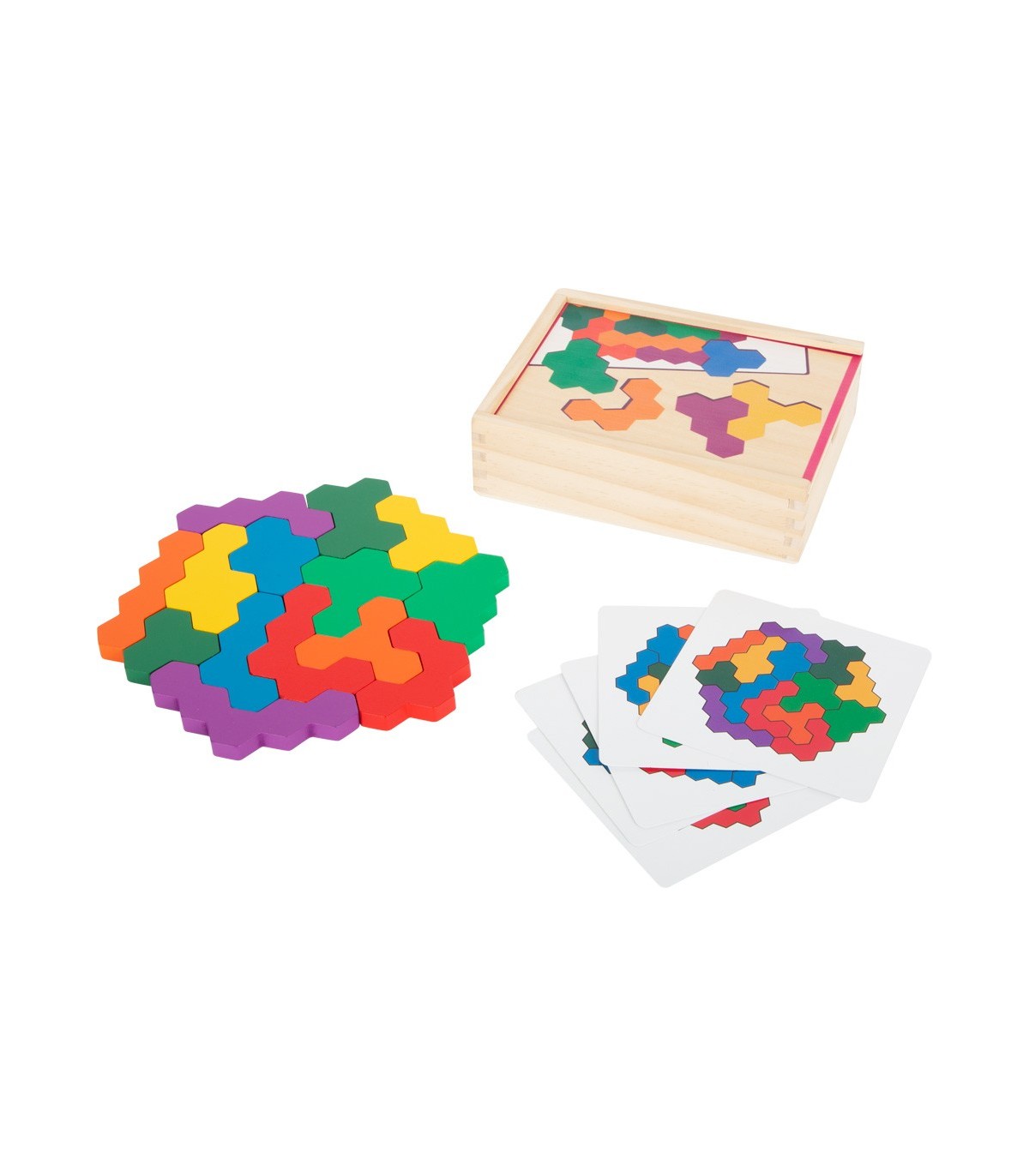 Un puzzle hexagonal comme casse-tête ! Dans ce puzzle spécial en bois, vous devez placer correctement les pièces complexes du jeu en forme de gaufre sur les cartes d'instructions. Le jeu de pose entraîne l'imagination ainsi que la reconnaissance des couleurs et des formes. Avec dix tâches sur cinq cartes, le traditionnel jeu de puzzle mathématique garantit un plaisir sans fin et stimulant !