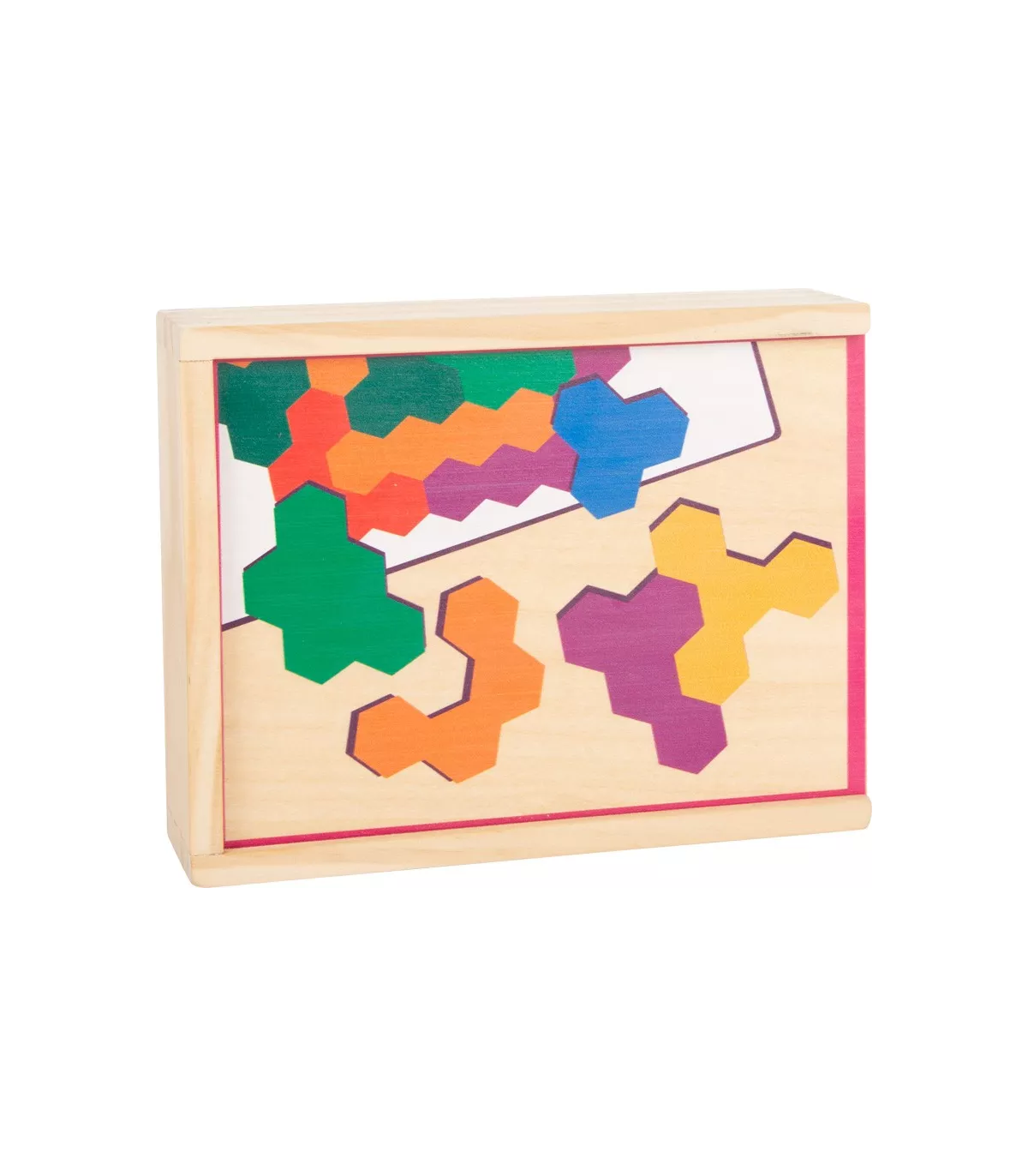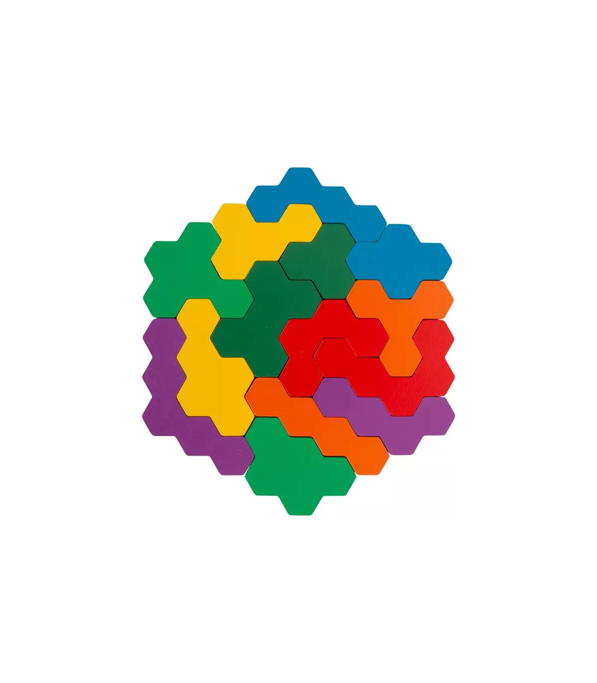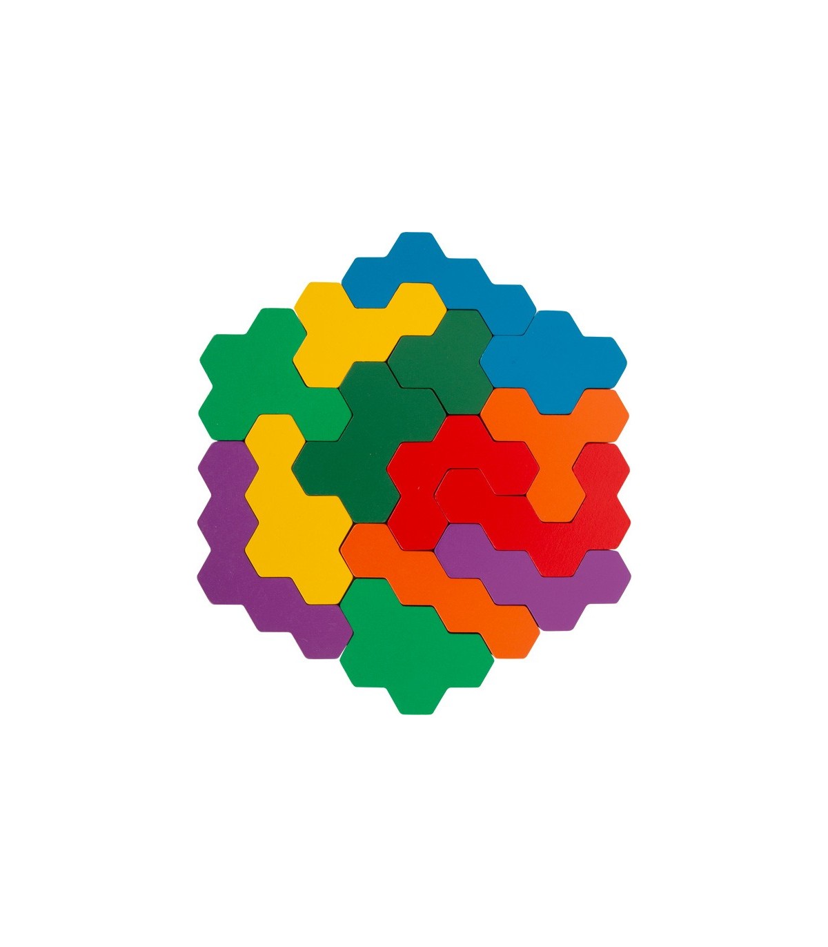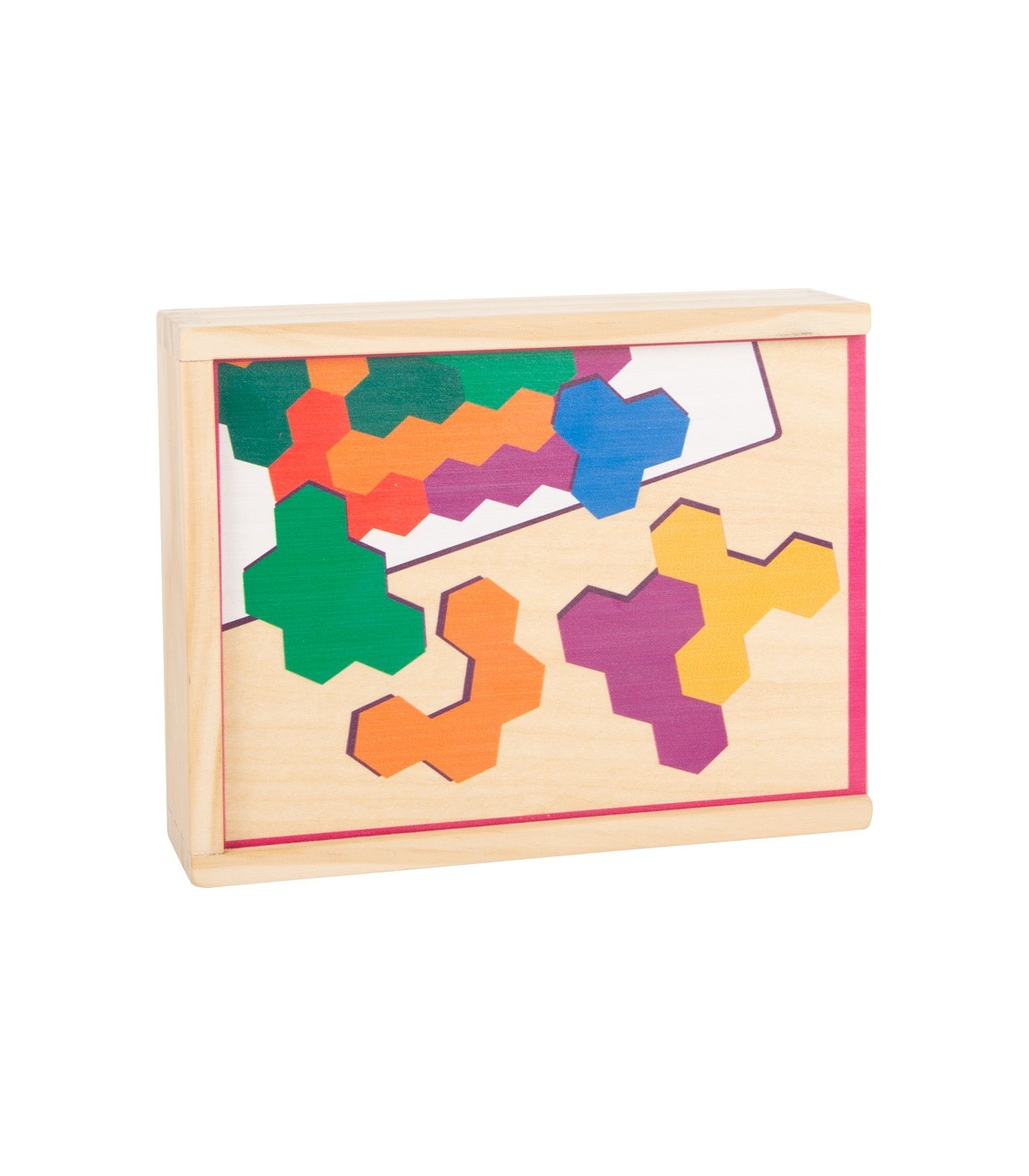 Un puzzle hexagonal comme casse-tête ! Dans ce puzzle spécial en bois, vous devez placer correctement les pièces complexes du jeu en forme de gaufre sur les cartes d'instructions. Le jeu de pose entraîne l'imagination ainsi que la reconnaissance des couleurs et des formes. Avec dix tâches sur cinq cartes, le traditionnel jeu de puzzle mathématique garantit un plaisir sans fin et stimulant !