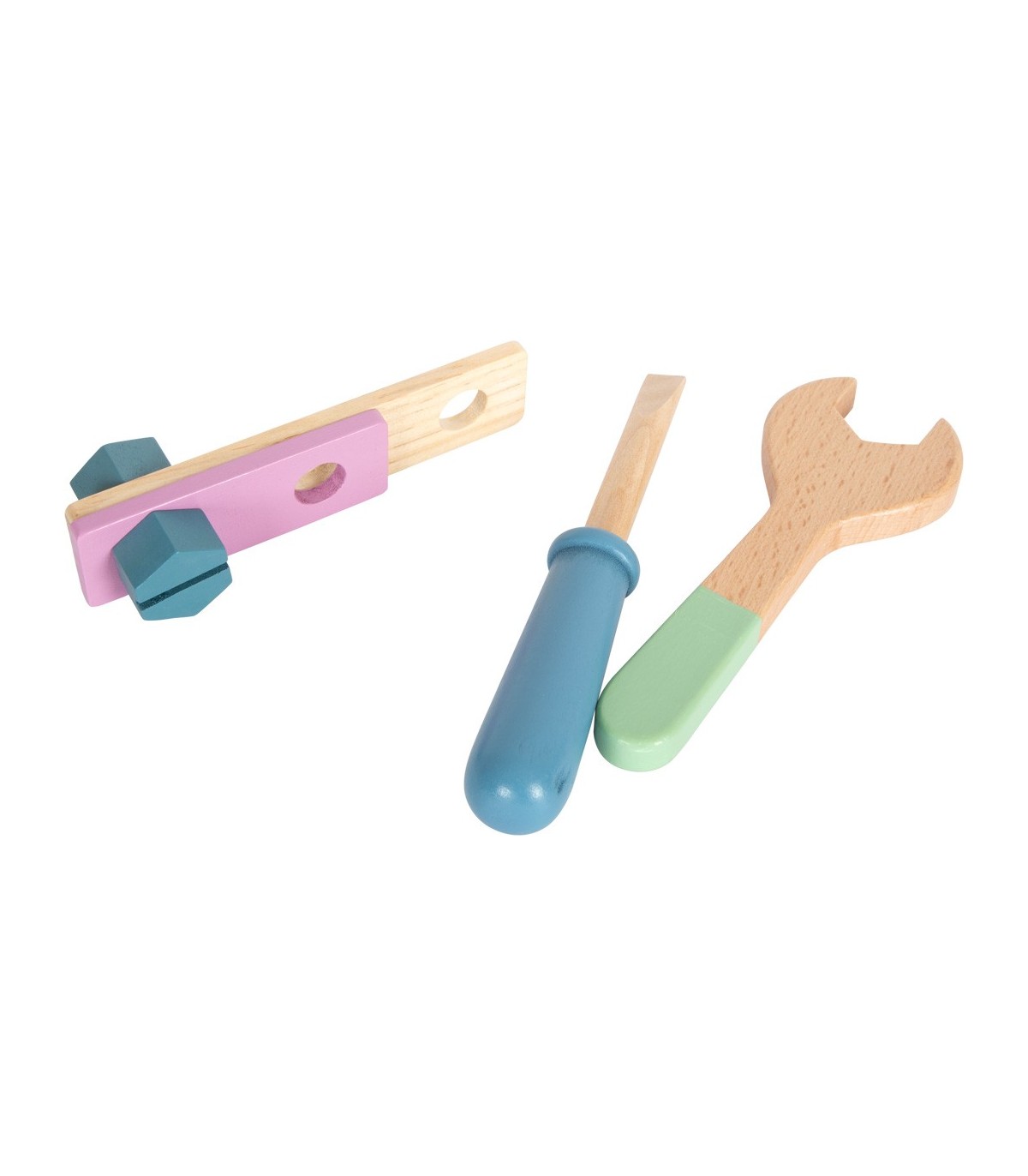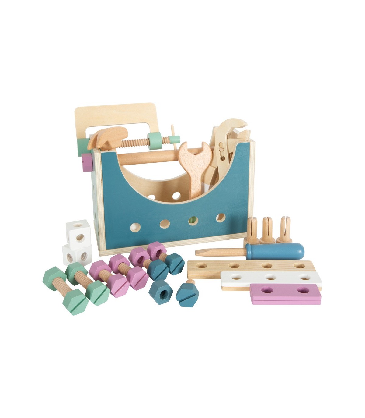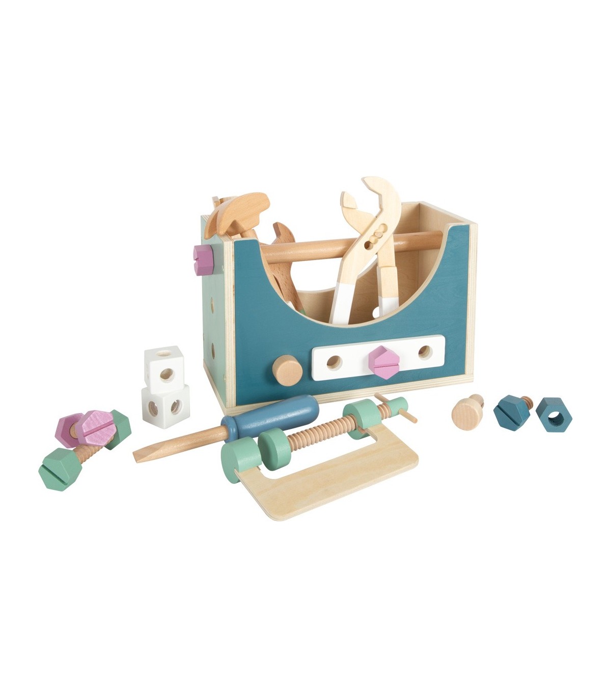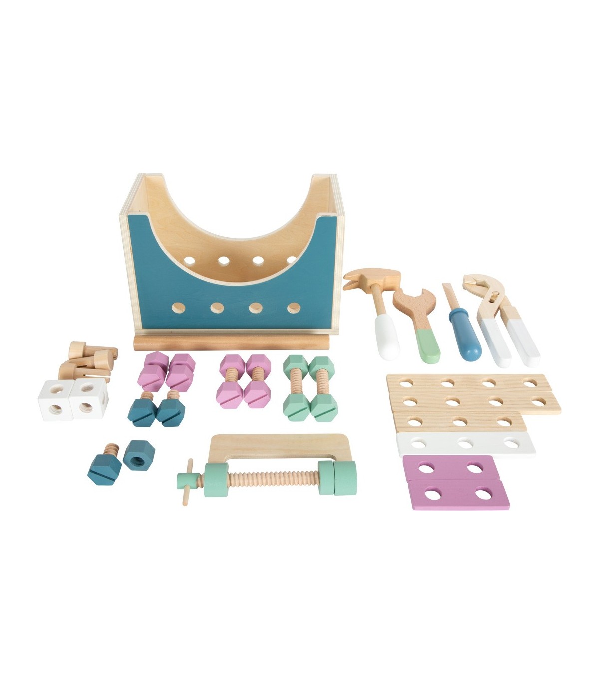 Ensemble composé d'un marteau, d'une clé plate, d'un tournevis, d'une pince pour pompe à eau, de vis, d'écrous, de bandes perforées, de clous et de cubes. Grâce à la grande pince à vis, les pièces peuvent être fixées avant l'assemblage. Tout en bricolant et en construisant, la créativité et la motricité fine sont entraînées et le jeu de rôle actif est encouragé.