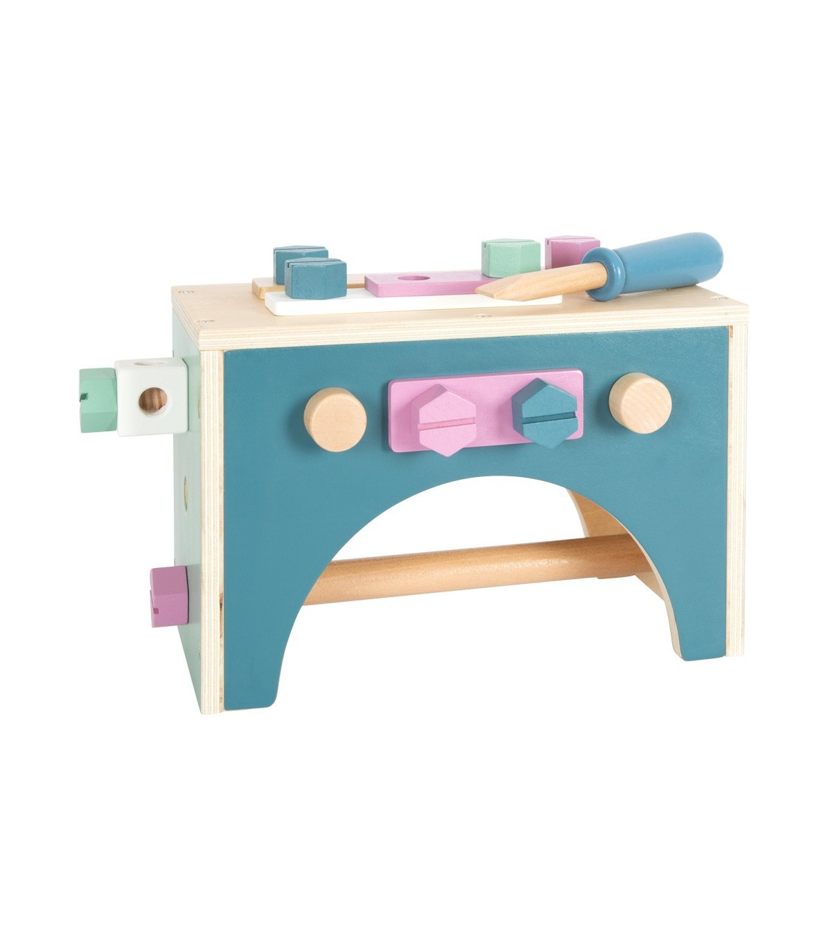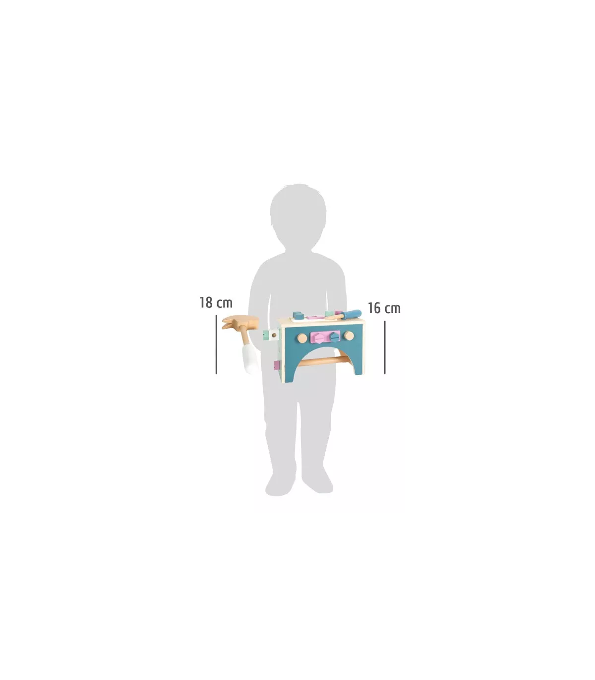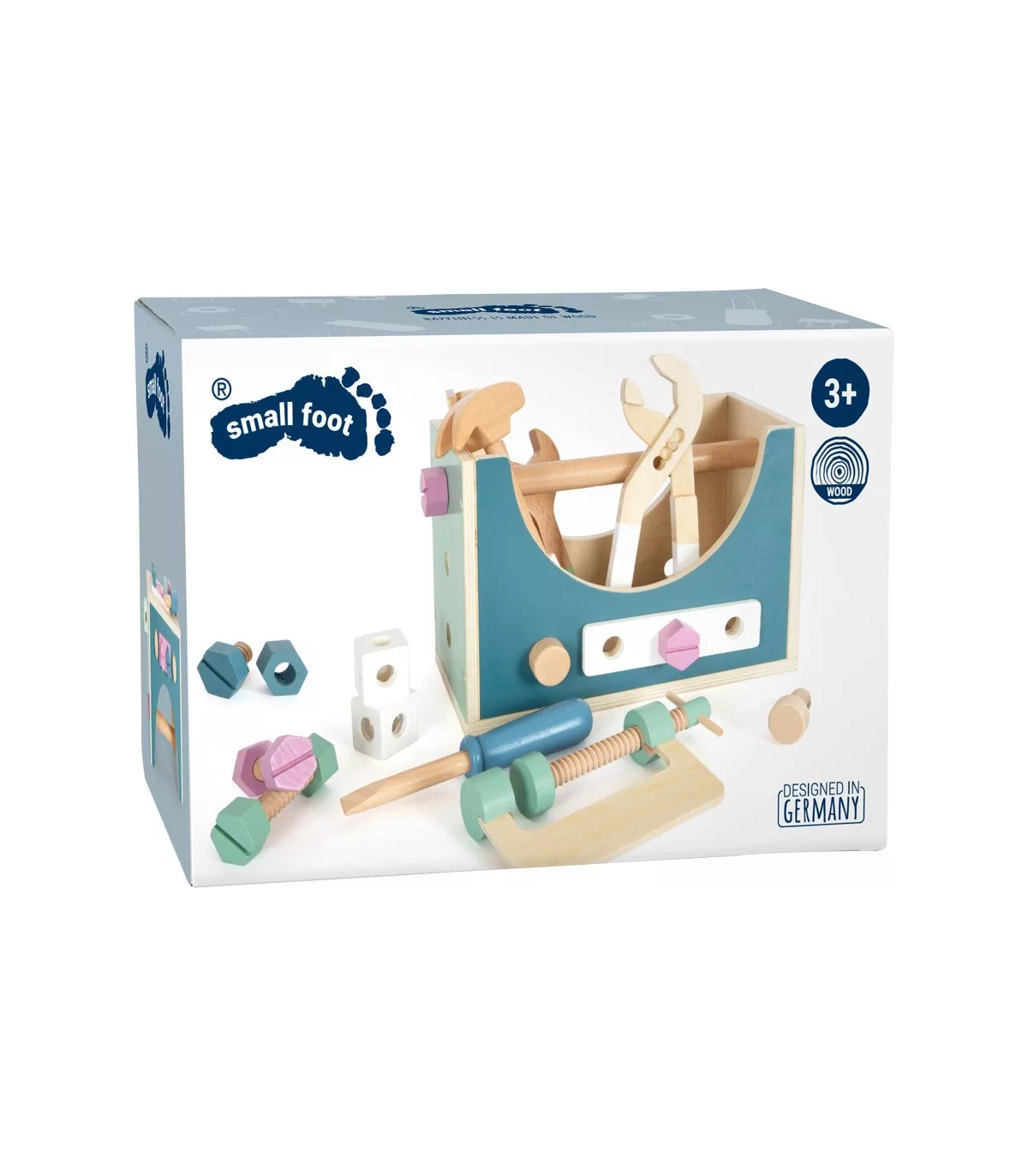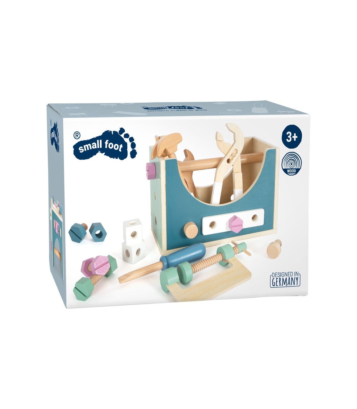 Ensemble composé d'un marteau, d'une clé plate, d'un tournevis, d'une pince pour pompe à eau, de vis, d'écrous, de bandes perforées, de clous et de cubes. Grâce à la grande pince à vis, les pièces peuvent être fixées avant l'assemblage. Tout en bricolant et en construisant, la créativité et la motricité fine sont entraînées et le jeu de rôle actif est encouragé.