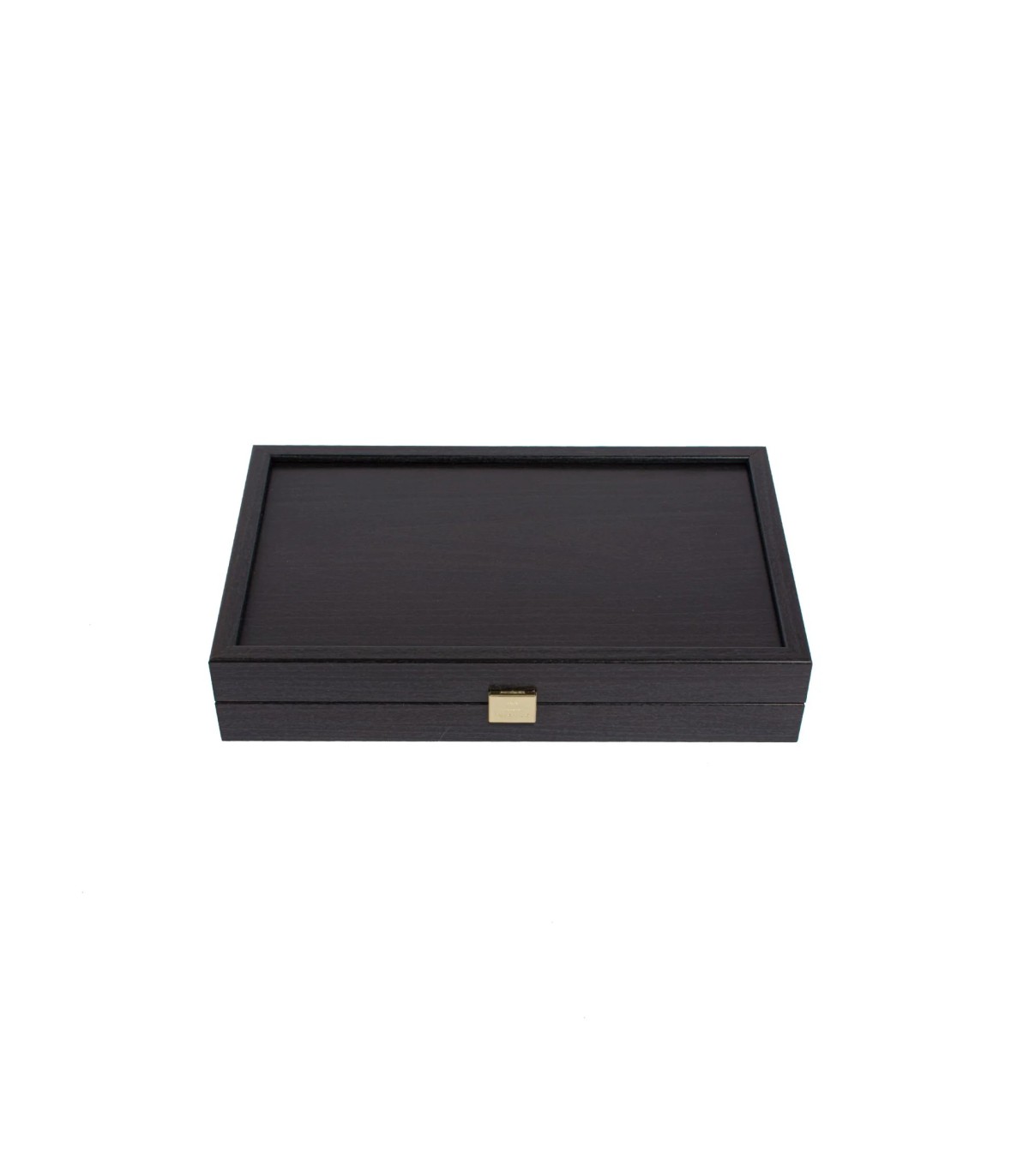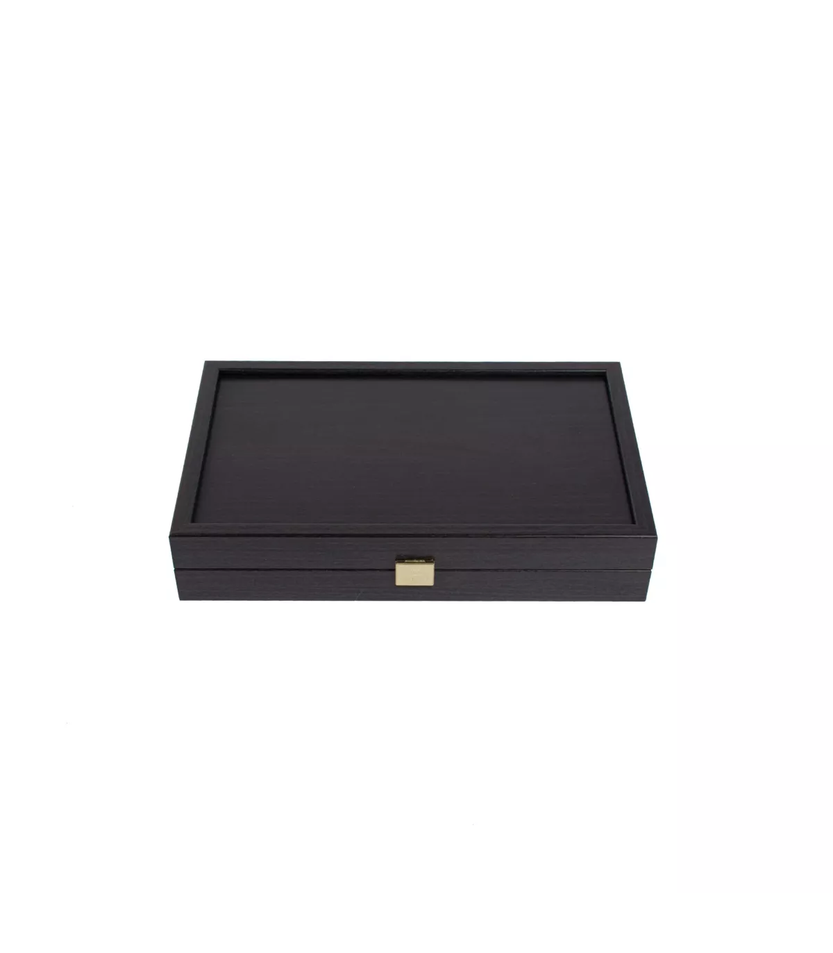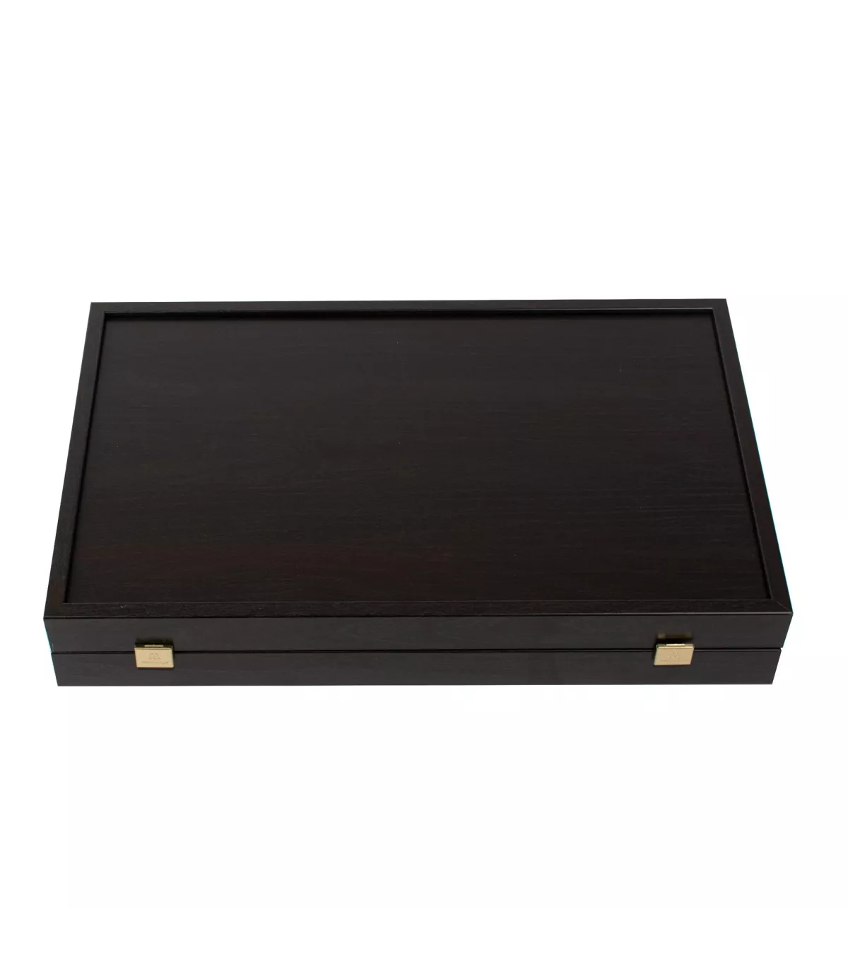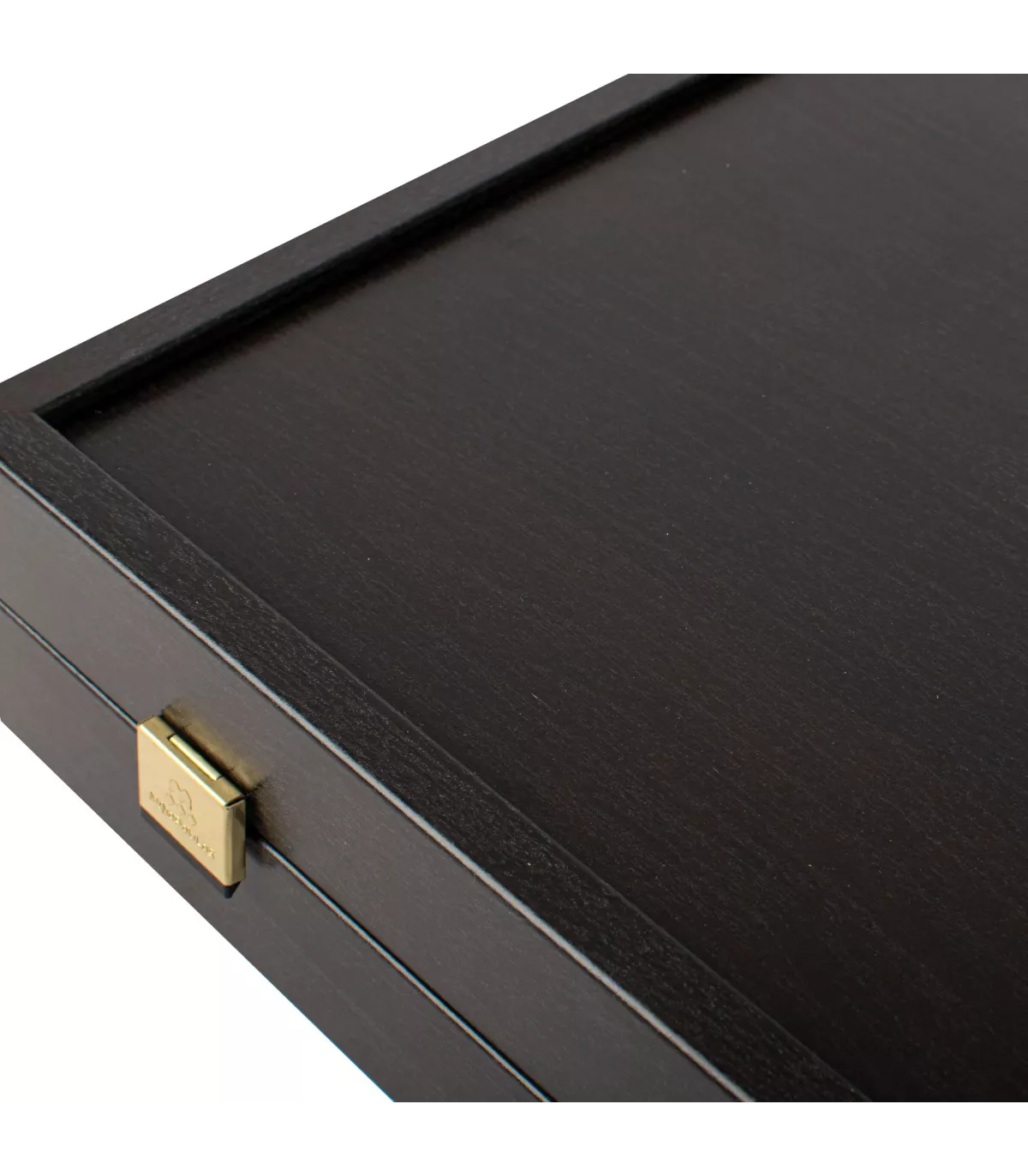 L'ensemble de backgammon de couleur wengé comporte une surface de jeu imprimée (et non incrustée) qui met en valeur un motif central en diamant. Les pointes contrastées en acajou et en chêne offrent un attrait visuel saisissant, améliorant à la fois l'apparence et la jouabilité de la planche. Les supports latéraux offrent un rangement pratique pour les dames, ajoutant ainsi à la fonctionnalité de l'ensemble.