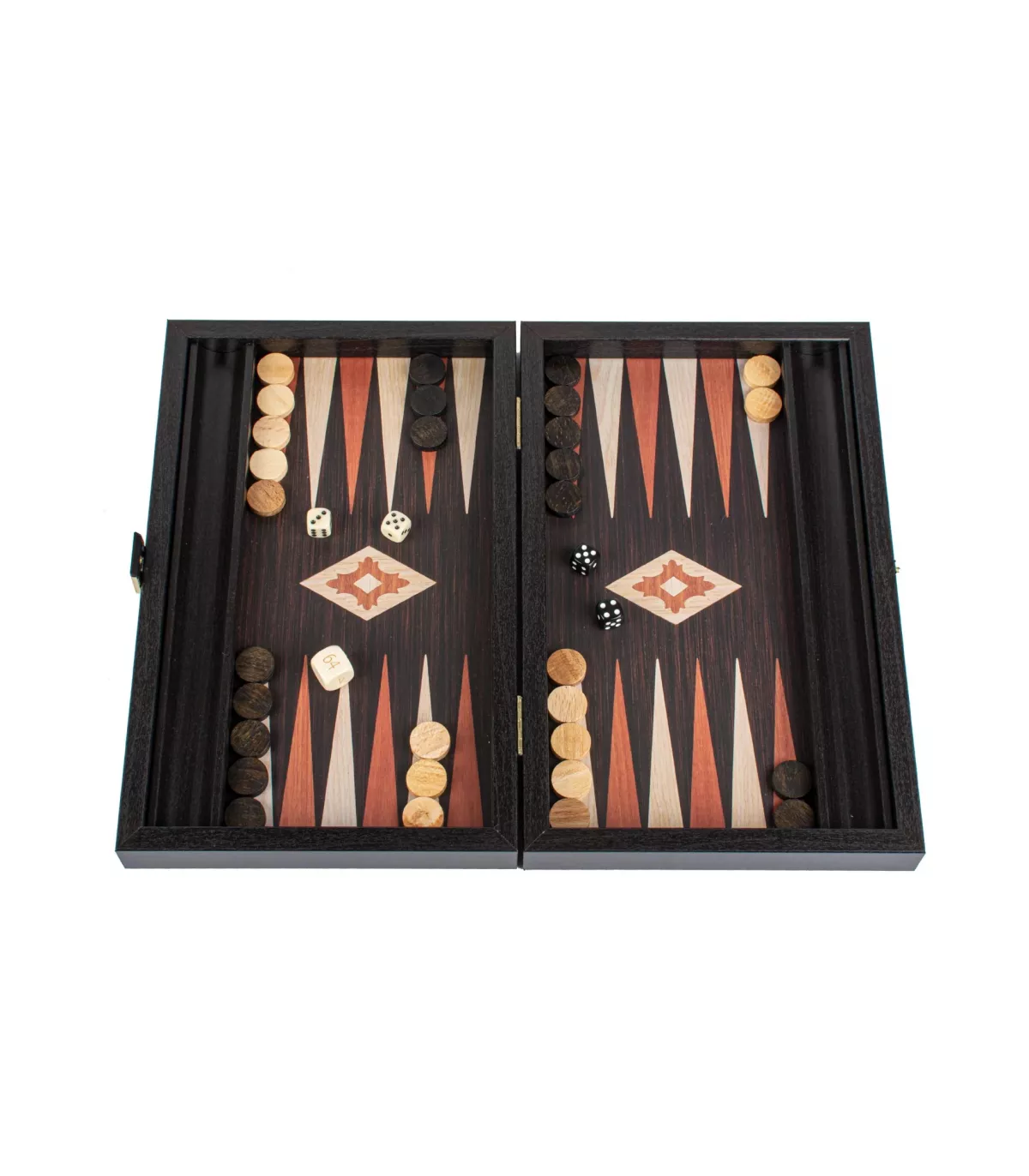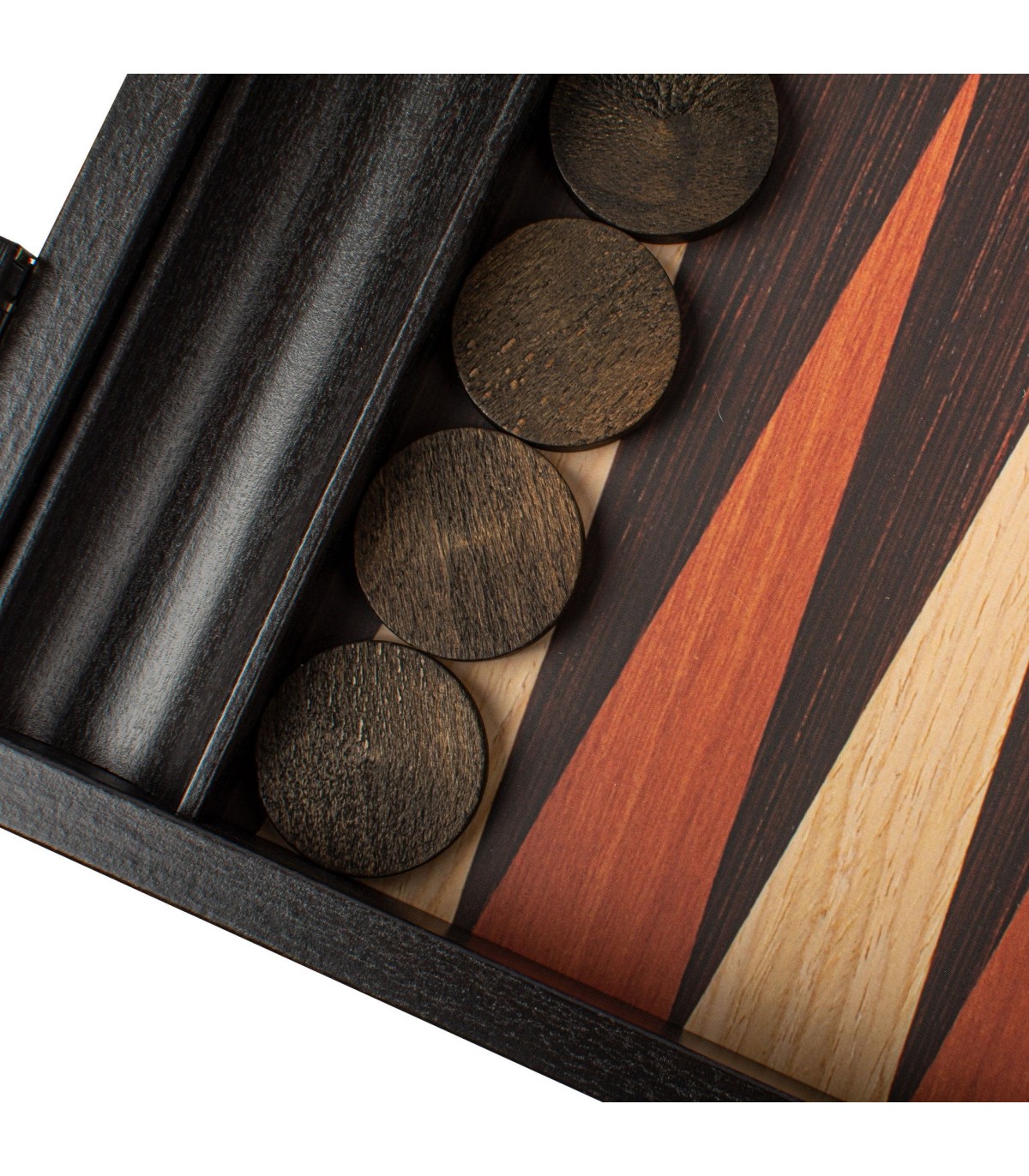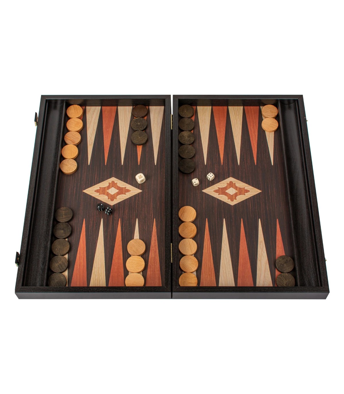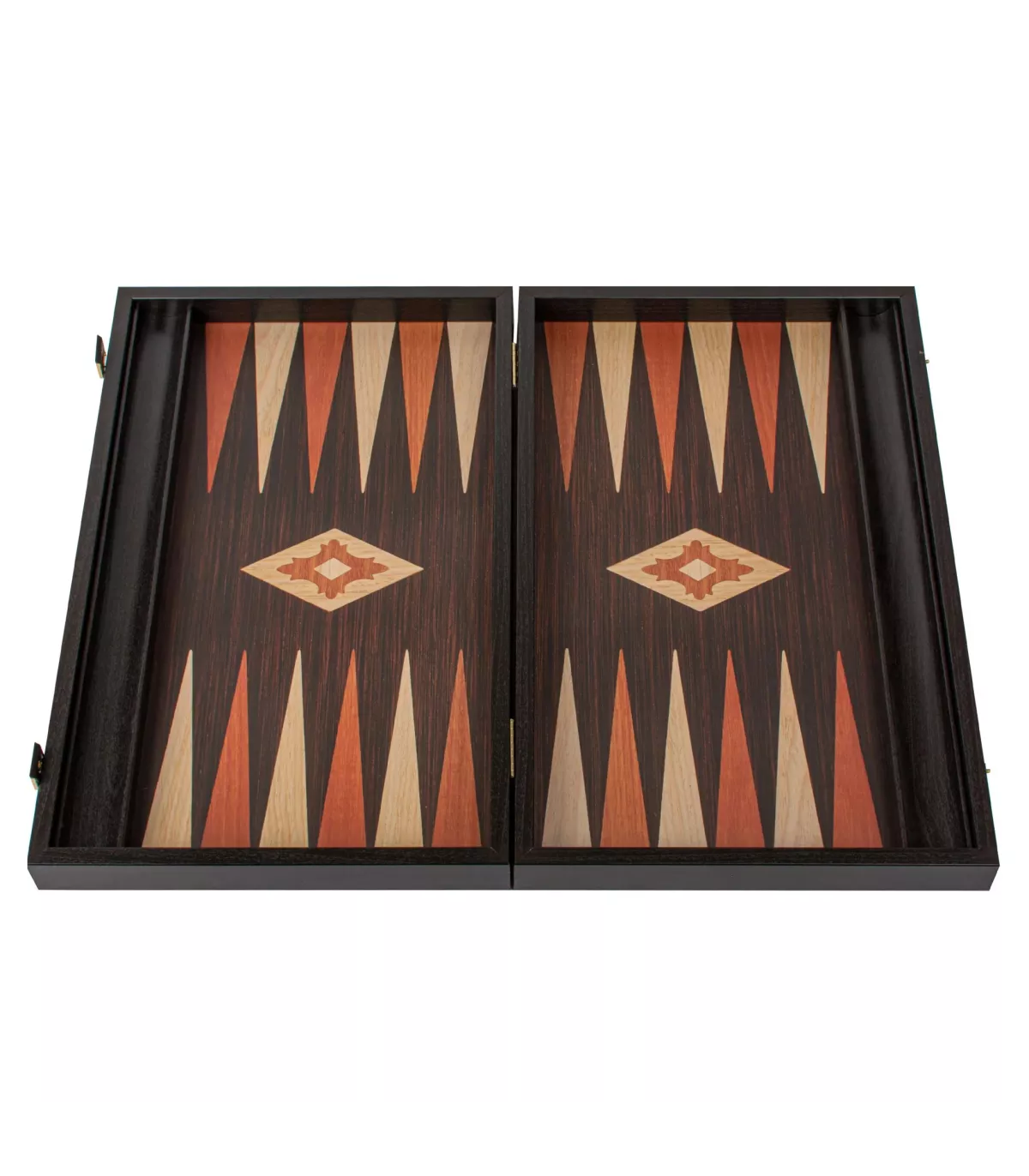 L'ensemble de backgammon de couleur wengé comporte une surface de jeu imprimée (et non incrustée) qui met en valeur un motif central en diamant. Les pointes contrastées en acajou et en chêne offrent un attrait visuel saisissant, améliorant à la fois l'apparence et la jouabilité de la planche. Les supports latéraux offrent un rangement pratique pour les dames, ajoutant ainsi à la fonctionnalité de l'ensemble.