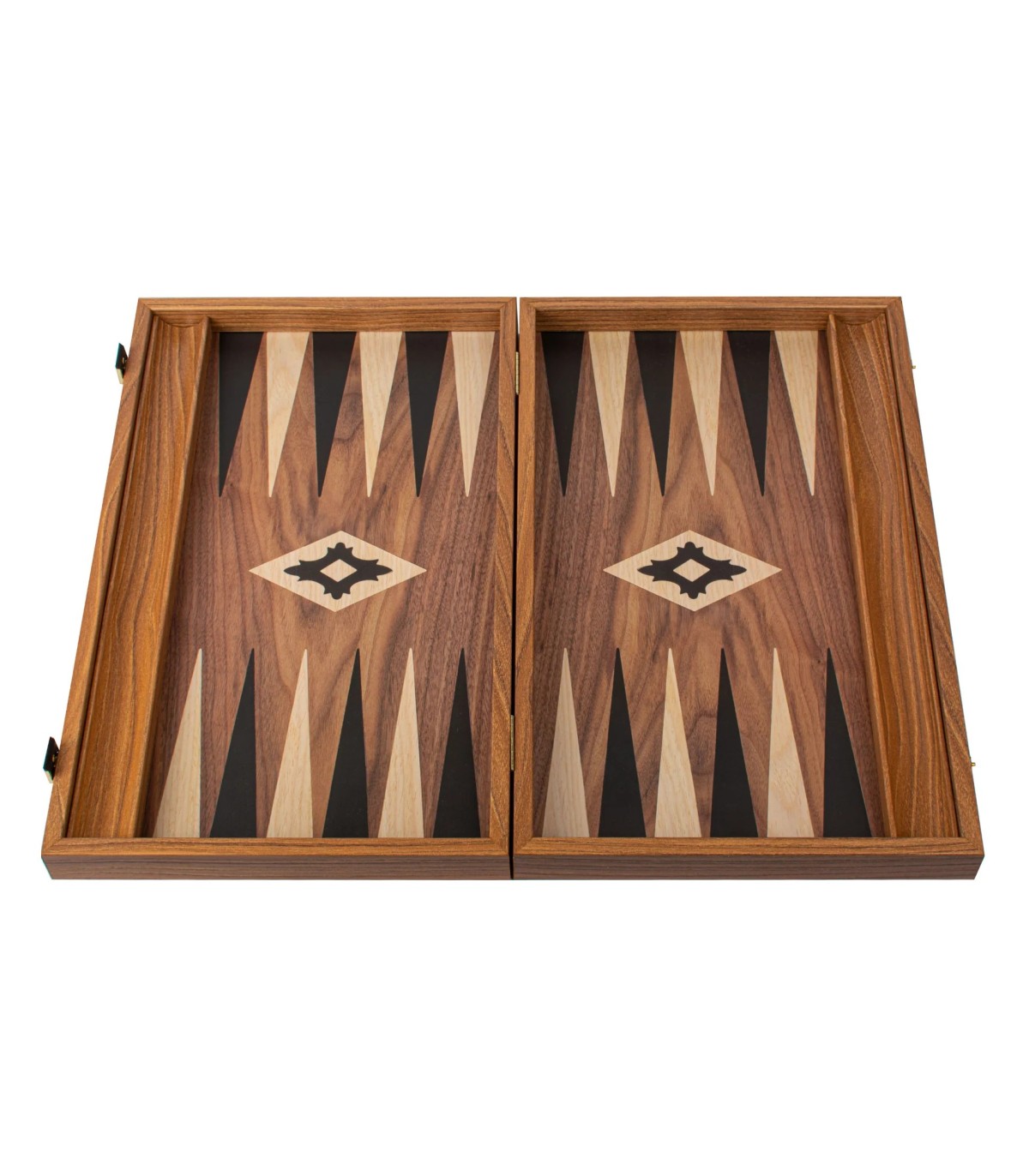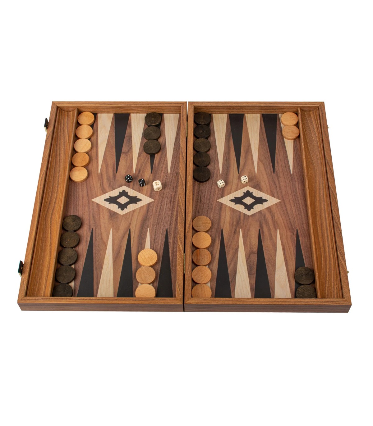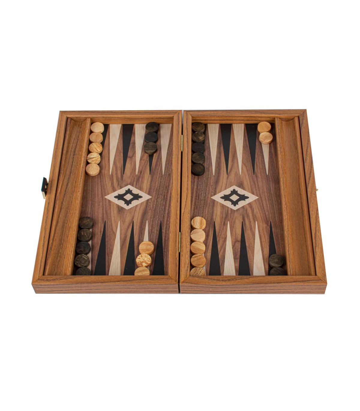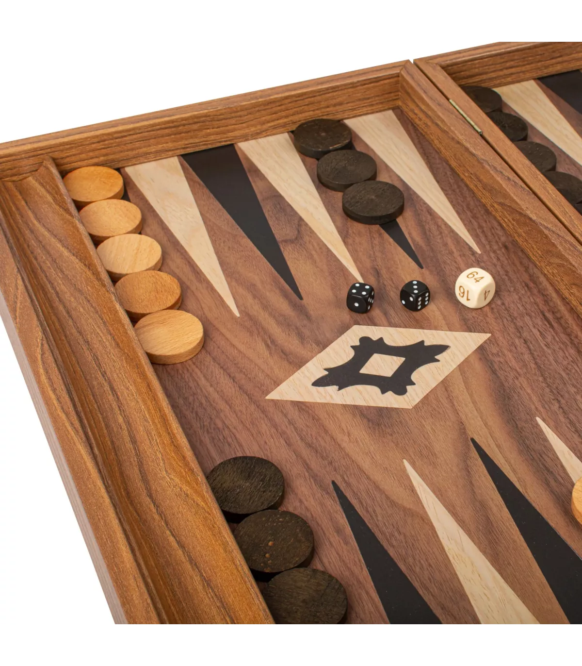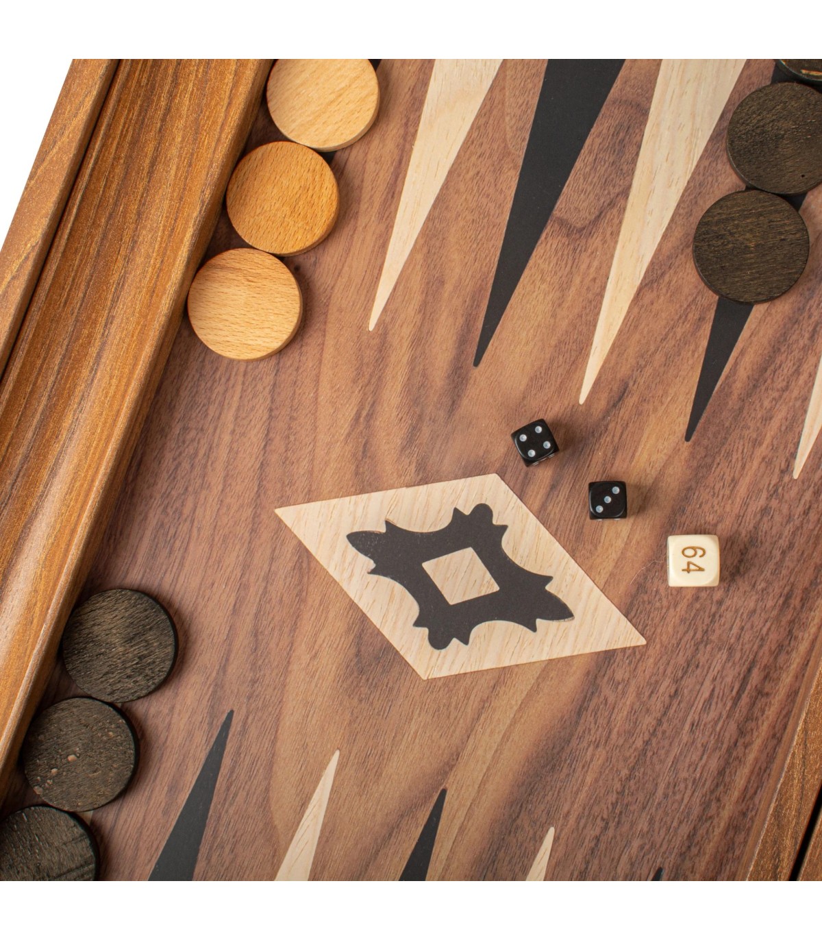 L'ensemble de backgammon de couleur noyer comprend une surface de jeu imprimée (non incrustée) qui met en valeur un magnifique motif de grain de bois. Les points contrastés en noir et en chêne offrent un attrait visuel saisissant, améliorant à la fois l'apparence et la jouabilité de la planche. Les supports latéraux offrent un rangement pratique pour les dames, ajoutant ainsi à la fonctionnalité de l'ensemble.