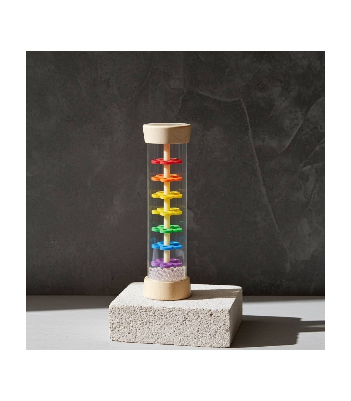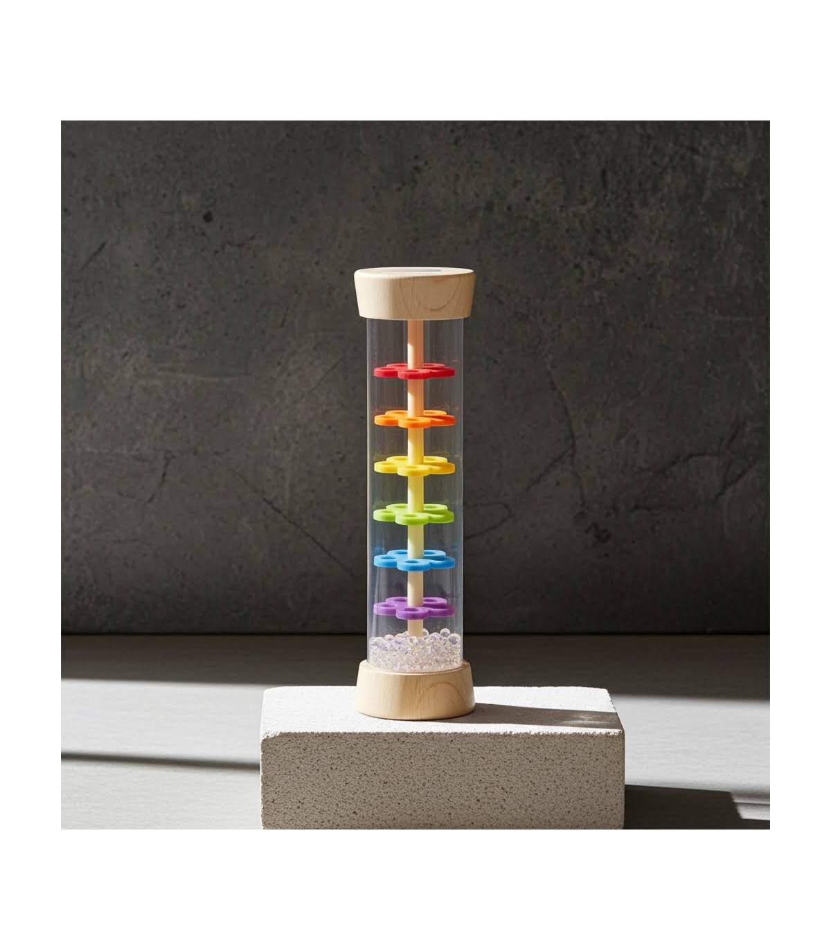 C'est à ça que ressemble la pluie ! Avec ce bâton de pluie, vous pouvez imiter les doux tons de pluie. Il peut être utilisé de plusieurs façons comme hochet, instrument de rythme, jouet sonore ou jeu sensoriel calmant et ne fascine pas seulement les enfants. Le piston en plastique transparent du bâtonnet de pluie permet de voir clairement les perles de verre qui s'écoulent à travers les six plaques perforées de couleur en forme de fleurs. L'acoustique et la perception visuelle sont ainsi entraînées.