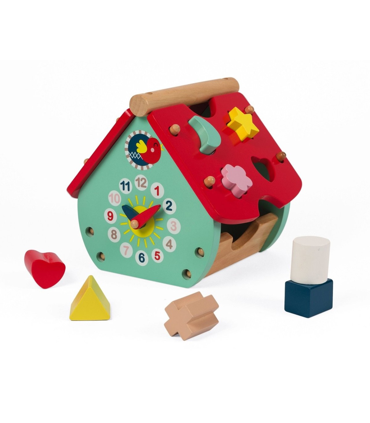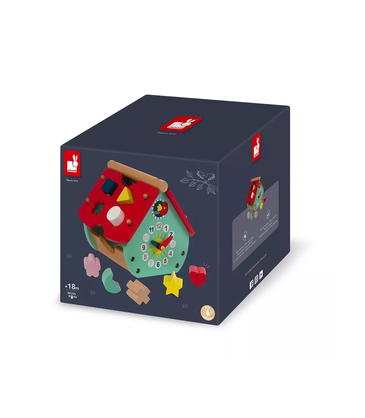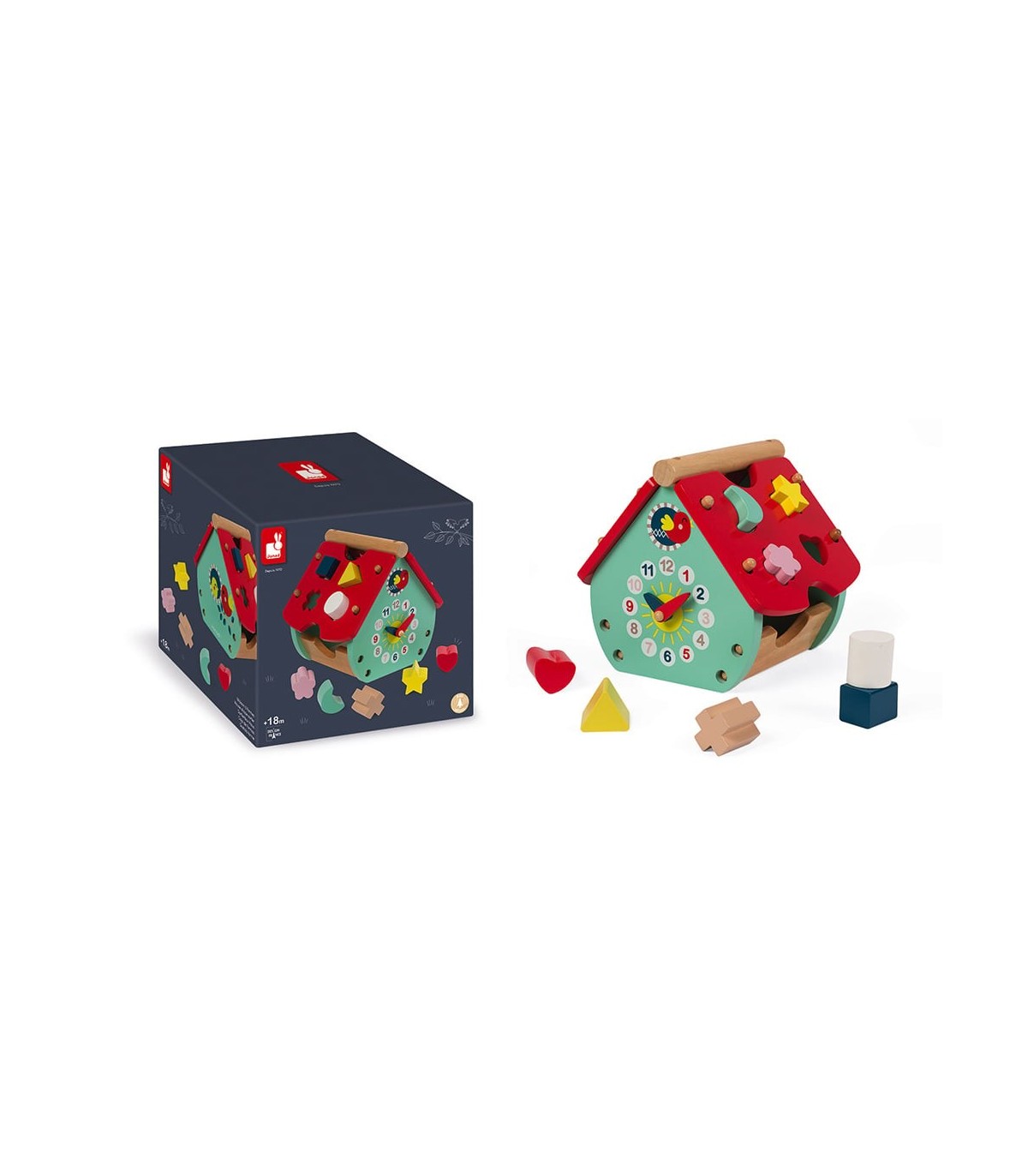 Cette maison colorée est idéale pour apprendre les couleurs, les formes ainsi que l’heure grâce à une jolie horloge imprimée et ses 2 aiguilles. Les 8 cubes à encastrer dans la maison aideront les tout-petits à développer leur dextérité tout en s’amusant. Toit amovible. Pratique pour emmener partout. Peinture standard. Impression en transfert à chaud. Toit, montants de la maison et cubes en MDF, fond de la maison en contreplaqué, traverses naturelles en hêtre et poignée en merisier. Boite couleur fermée.