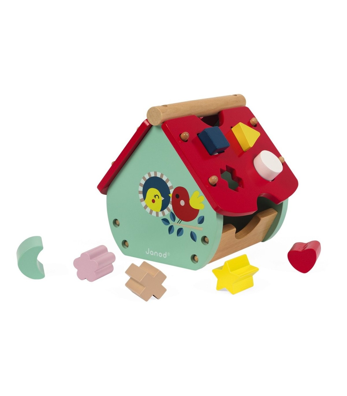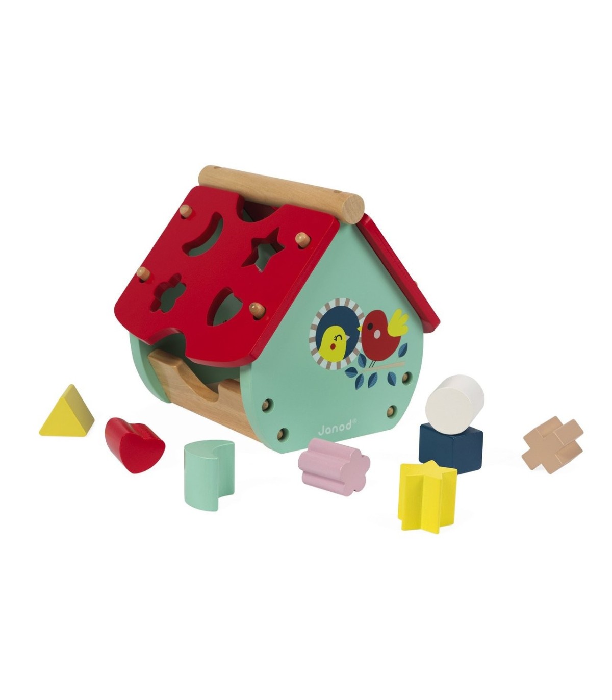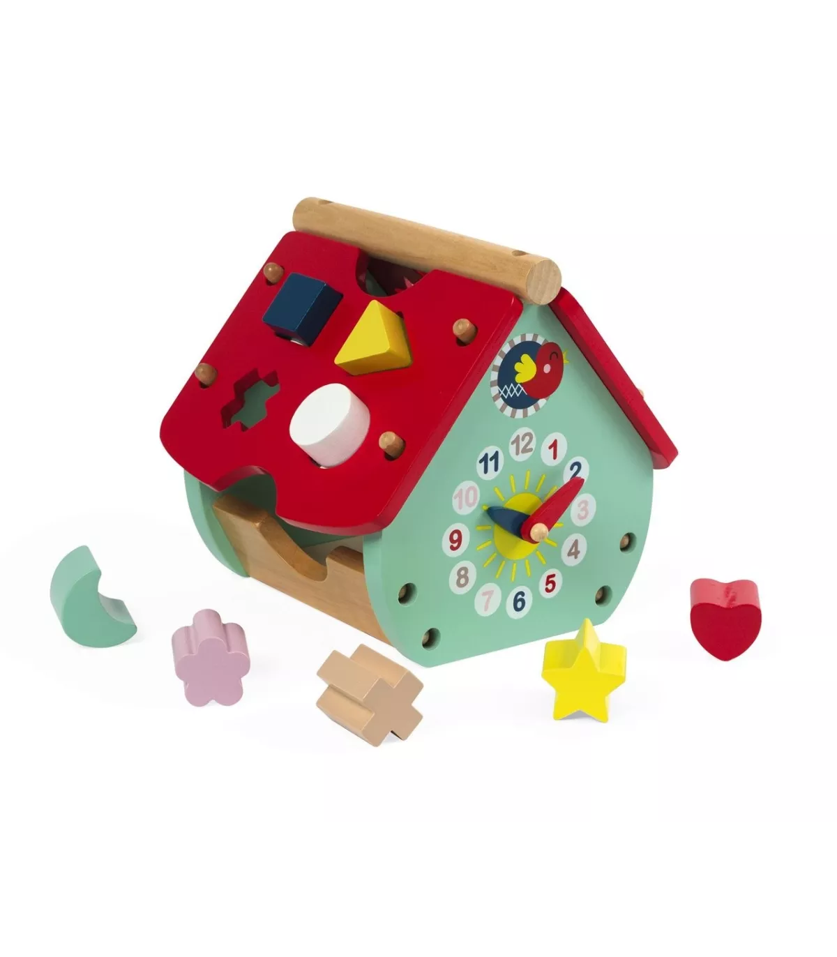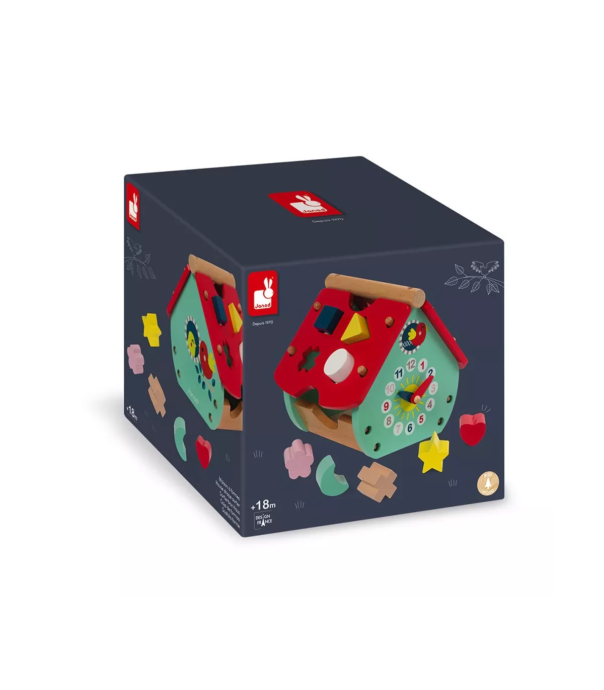 Cette maison colorée est idéale pour apprendre les couleurs, les formes ainsi que l’heure grâce à une jolie horloge imprimée et ses 2 aiguilles. Les 8 cubes à encastrer dans la maison aideront les tout-petits à développer leur dextérité tout en s’amusant. Toit amovible. Pratique pour emmener partout. Peinture standard. Impression en transfert à chaud. Toit, montants de la maison et cubes en MDF, fond de la maison en contreplaqué, traverses naturelles en hêtre et poignée en merisier. Boite couleur fermée.
