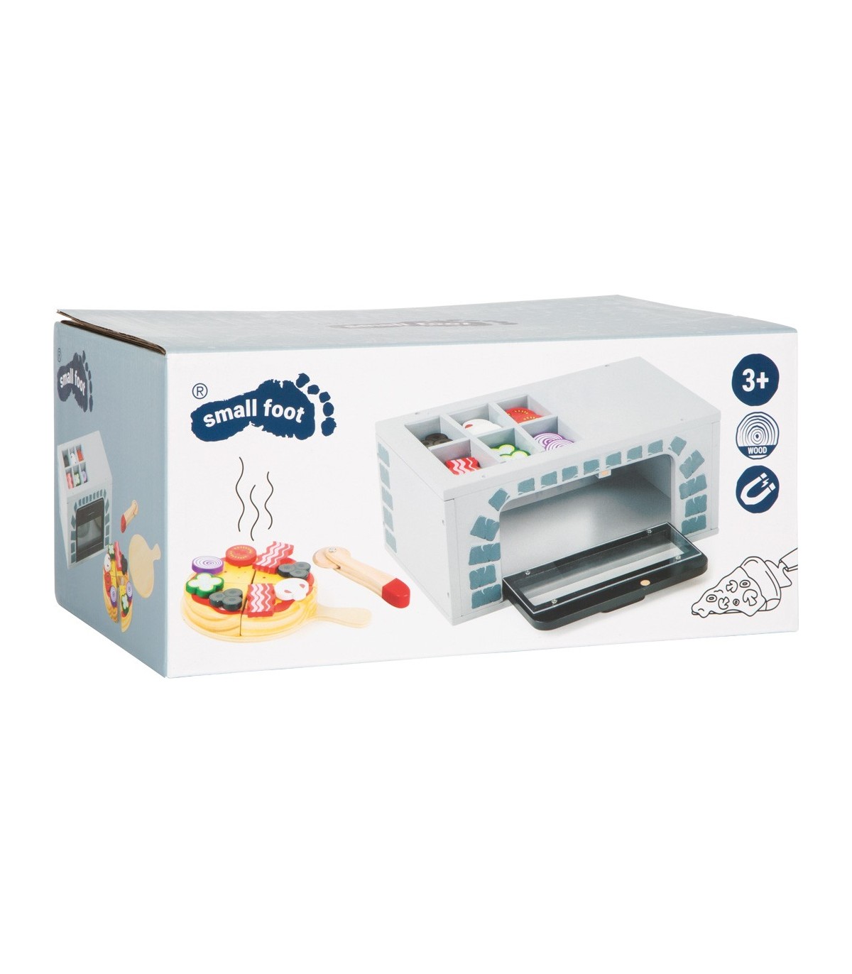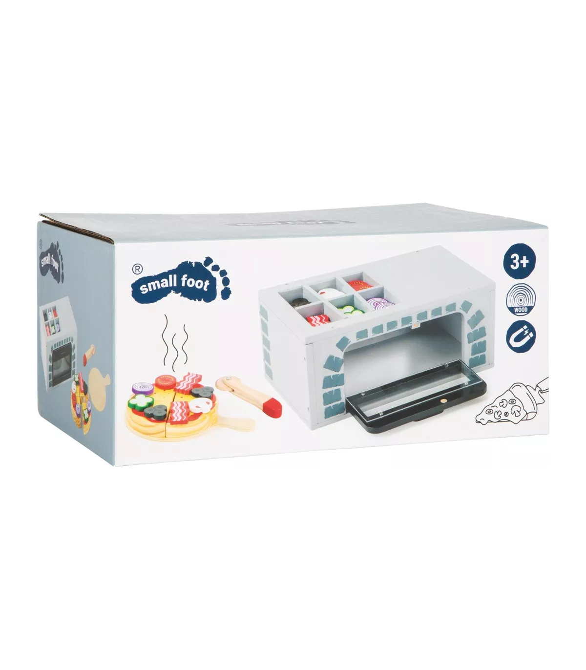 Faire des pizzas comme les grands! Ici, les petits peuvent créer leur propre pizza et étaler les différentes garnitures à fermeture Velcro sur le fond de pizza. À l´aide de la glissière en bois, elle descend ensuite dans le four qui peut être ouvert et fermé par un volet mobile. Les garnitures sont stockées dans des compartiments clairement disposés sur le four.