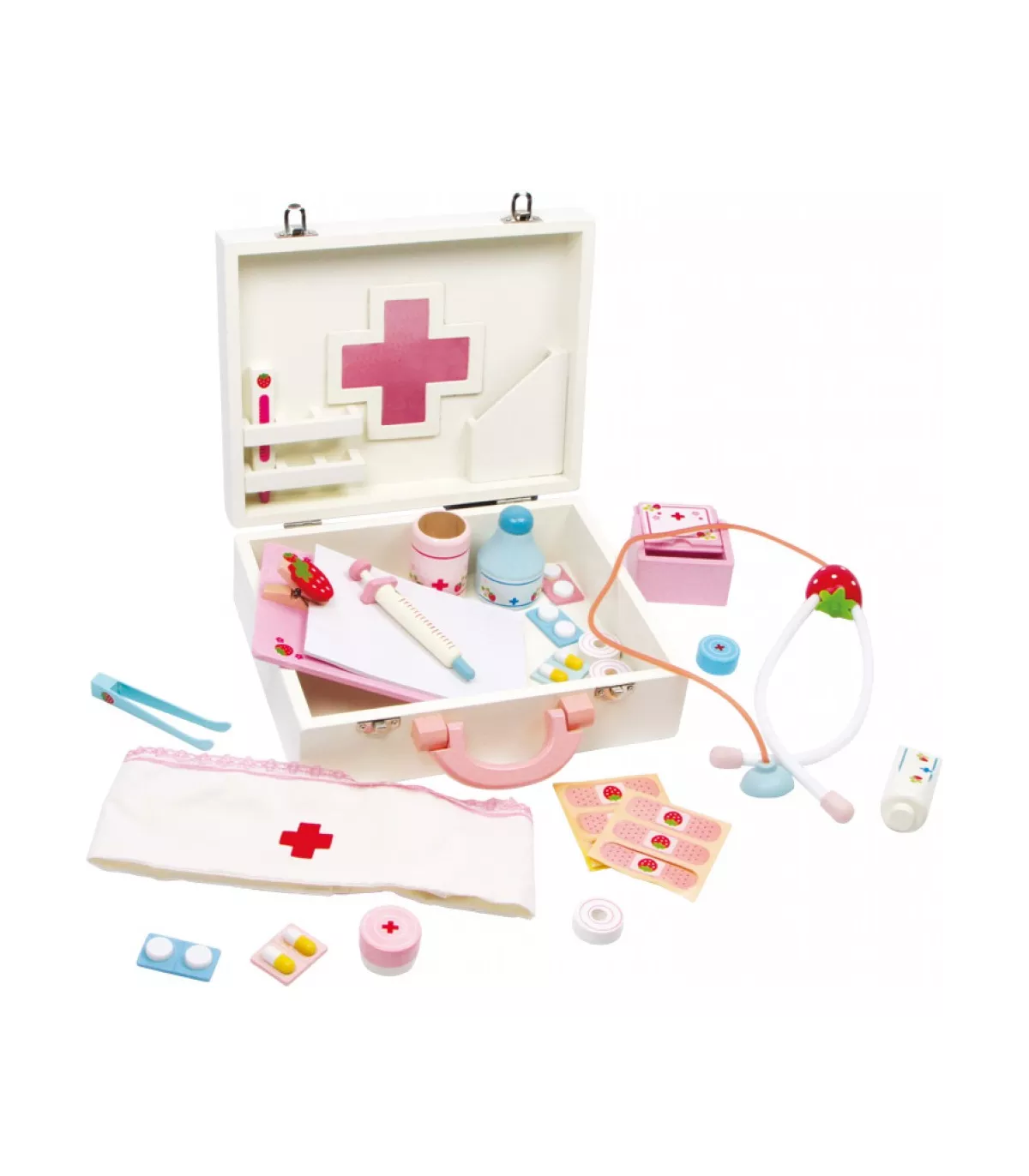 Équipée d‘un thermomètre, stéthoscope et coiffe, chaque petite infirmière peut faire sa visite dans la clinique de poupée! Avec de nombreux accessoires en bois laqué: porte-bloc avec feuilles, boîte à pilules avec 6 "plaquettes cachet", tube à crème, flacon à teinture et 6 bandes de sparadrap.